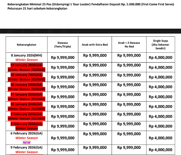 • Tour yang sudah di deposit, maka tarif dasar secara otomatis mengikat, tetapi Harga airport tax internasional/Tipping/Visa masih dapat berubah sewaktu-waktu tanpa pemberitahuan terlebih dahulu sesuai dengan kondisi yang berlaku(seperti kenaikan harga signifikan akibat kurs, kenaikan fuel surcharge, dll) dan sebelum keberangkatan atau tiket diissued(Untuk Tax internasional). Sebelum adanya deposit, harga basic tour dapat berubah-ubah sewaktu-waktu.