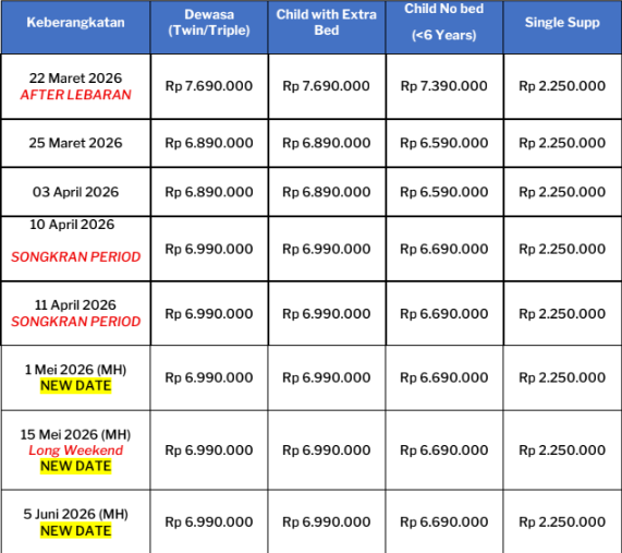 • Harga tour kami merupakan harga All in (Termasuk tax international), dengan tarif dasar mengikat apabila tamu sudah deposit, namun tax internasional tidak mengikat.