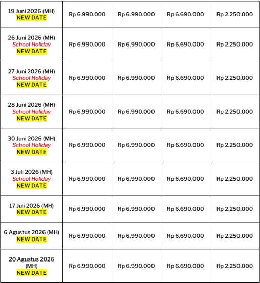 Ketersediaan : 11 Apr 2026 1, 15 Mei 2026 5, 19, 26, 27, 28, 30 Jun 2026 3, 17 Jul 2026 6, 20 Agust 2026 11, 25 Sept 2026 2, 16 Okt 2026 12, 20 Nov 2026 3, 12 Des 2026
