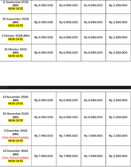 • Tour yang sudah di deposit, maka tarif dasar secara otomatis mengikat, tetapi Harga airport tax internasional/Tipping/Visa masih dapat berubah sewaktu-waktu tanpa pemberitahuan terlebih dahulu sesuai dengan kondisi yang berlaku(seperti kenaikan harga signifikan akibat kurs, kenaikan fuel surcharge, dll) dan sebelum keberangkatan atau tiket diissued(Untuk Tax internasional). Sebelum adanya deposit, harga basic tour dapat berubah-ubah sewaktu-waktu.