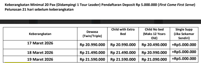 • Keberangkatan Minimal 20 Pax (Didampingi 1 Tour Leader) dengan pemberlakuan First Come First Serve