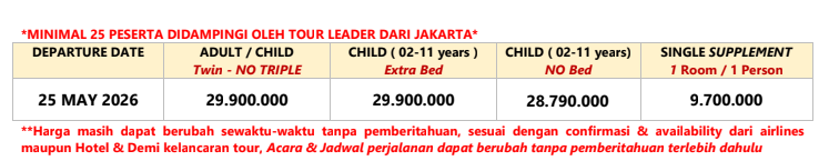 • Uang Muka Pendaftaran Rp 12.000.000/PAX tidak dapat dikembalikan (down payment non-refundable) + Biaya Visa (jika ada). Bila terjadi pembatalan oleh peserta dengan alasan apapun (non-refundable)